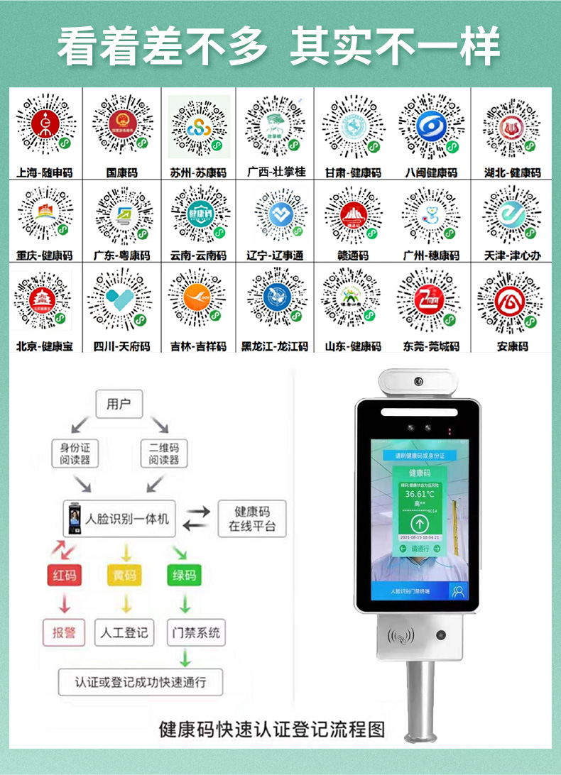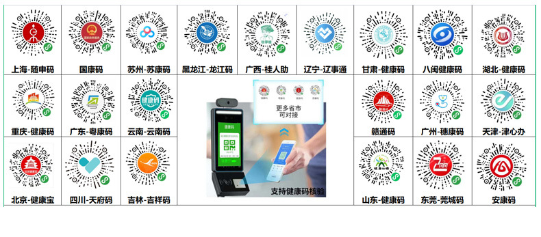 國家通用碼-國康碼、廣東-粵康碼、四川-天府通、江蘇-蘇康碼、內(nèi)蒙-內(nèi)蒙碼、上海-隨申碼、湖北-湖北碼、安徽-安徽碼、福建-八閩碼、河北健康碼、云南-云南碼、湖南-湖南碼,更多省市可對(duì)接。