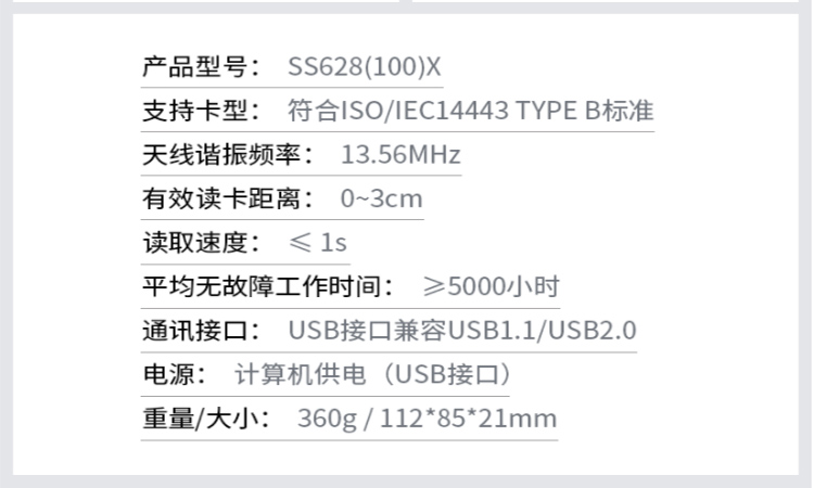 (*由于產(chǎn)品升級或其他原因,神思SS628-100X身份證閱讀器產(chǎn)品實(shí)際參數(shù)有可能變更,以實(shí)際產(chǎn)品為準(zhǔn)。本文中的所有陳述、信息和建議也不構(gòu)成任何明示或暗示的擔(dān)保)